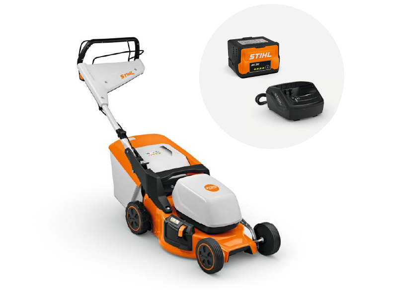 Cortacésped de batería RMA 248 T en un set con batería AK 30 S y cargador estándar AL 101: Trabajo cómodo en jardines pequeños gracias a la tracción por ruedas