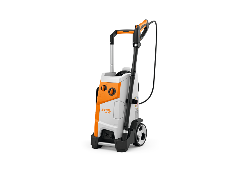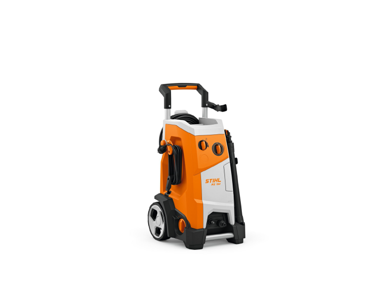 Potente y resistente hidrolimpiadora RE 150 de 140 bar. Con amplio equipamiento. Bomba de alta presión de latón, Regulación de presión / cantidad con manómetro, deposito integrado con control de dosificación para detergente, boquilla de chorro plano ajustable, boquilla de rotativa de cerámica resistente al desgaste, acoplamiento rápido antitorsión.