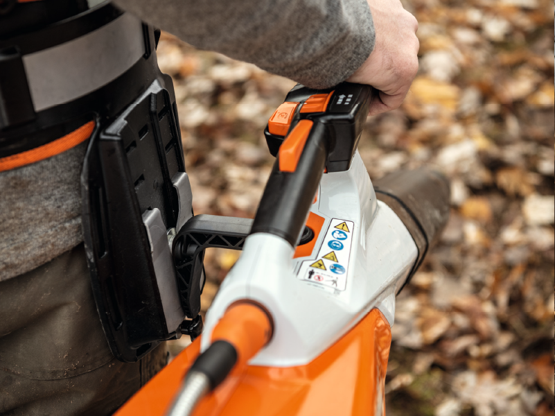 El soplador de batería más potente de STIHL. Funcionamiento silencioso y agradable para uso profesional en el centro de la ciudad y en entornos sensibles al ruido. Su innovador diseño es ideal para trabajar en espacios estrechos e inaccesibles. Para superficies extensas o largas horas de trabajo, el BGA 200 puede acoplarse con facilidad al ErgoSoporte especialmente diseñado para aumentar la comodidad. Es posible alternar entre llevarlo en la mano o en el soporte con gran rapidez según sea necesario. Esto convierte al BGA 200 en una máquina 2 en 1. El diseño curvo del BGA 200 garantiza que el soplador no se doble ni incline a pesar del fuerte flujo de aire, de manera que alivia la tensión en la muñeca del usuario. La segunda empuñadura y el bloqueo de accionamiento proporcionan una comodidad adicional. Con solo pulsar un botón, la longitud del tubo de soplado puede ajustarse fácilmente para adaptarse a diferentes situaciones de limpieza, como en zonas con esquinas. El cómodo ErgoSoporte de serie se fija al arnés de la cadera de las baterías de mochila AR L.